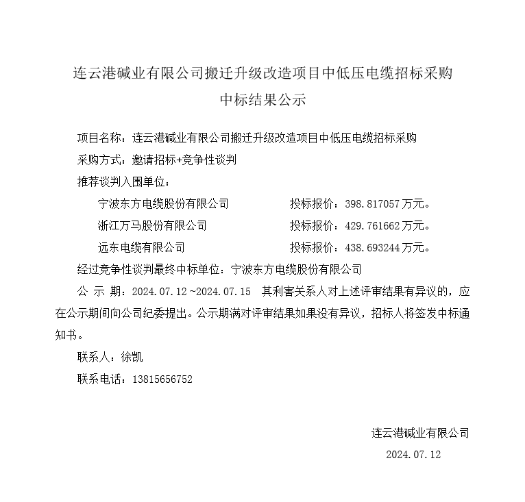 中低壓電纜中標招標采購中標結(jié)果公示